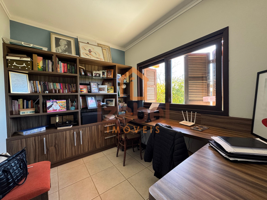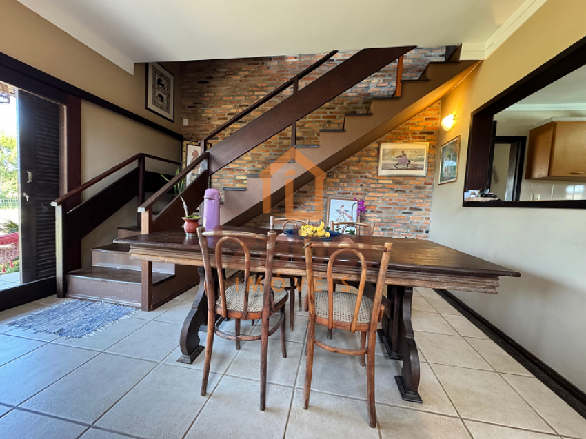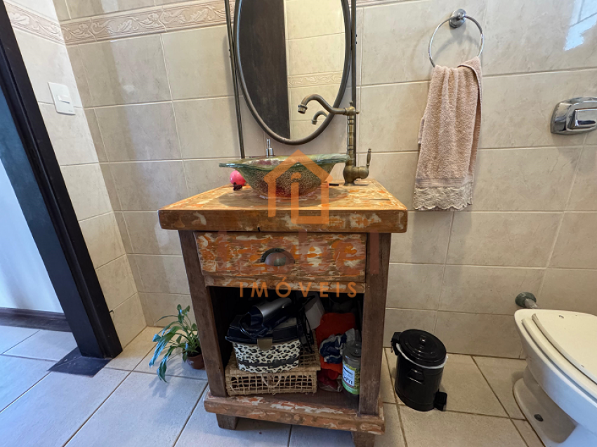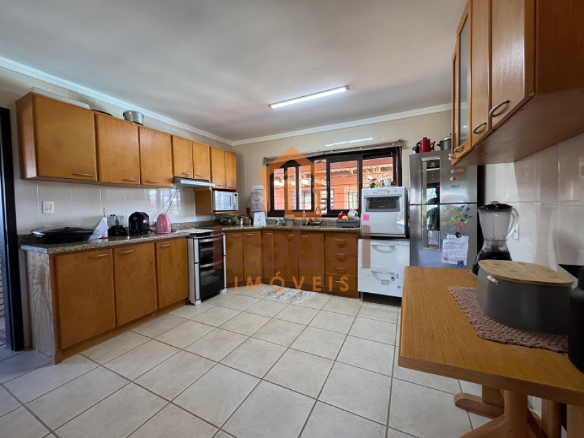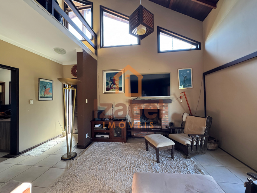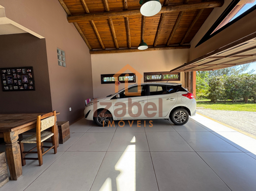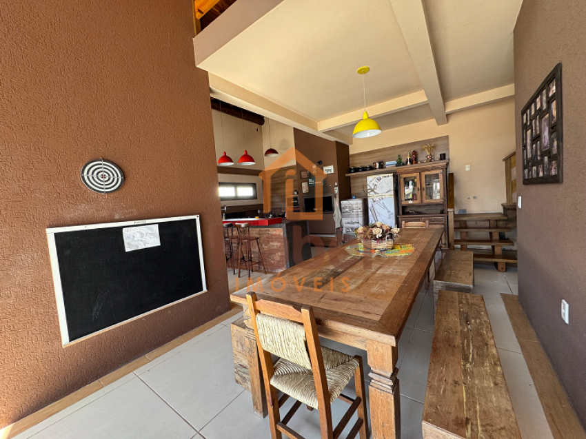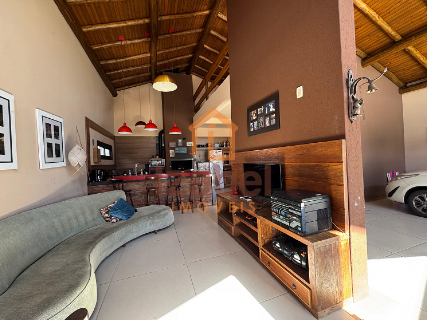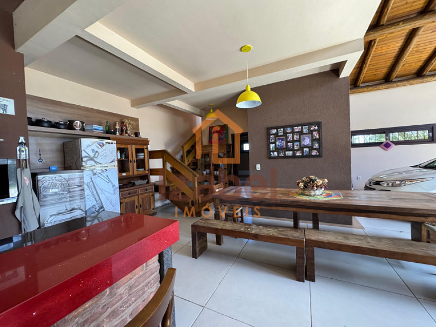 Ainda contém uma edícula com área gourmet com churrasqueira à carvão, fogão à lenha e cozinha equipada, mesa de jogos, ampla garagem, um dormitório com banheiro e mezanino com mais um dormitório.